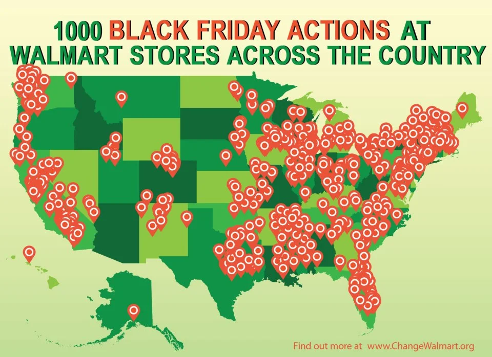 The courageous worker-led strikes/ actions at nearly 1,000 stores of our nation's largest retailer (and largest food retailer), Walmart, on Black Friday, are nothing short of monumental. As former Secretary of Labor Robert Reich points out, the 40 year attack on worker's rights and wages were made possible, in part, by the precipitous decline of labor union power and representation. As the number of private sector workers enrolled in unions has plummeted, so too has worker bargaining power; and with it wages, benefits, and in the past year, even an offensive led by Wisconsin Governor Walker against what the UN long ago deemed a universal human right: the right to collectively bargain.