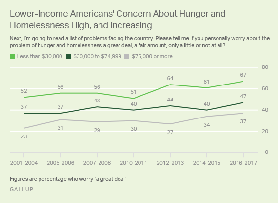 Gallup, in their 2017 poll, remarked "Concern about Hunger and Homelessness at a High among US adults."
