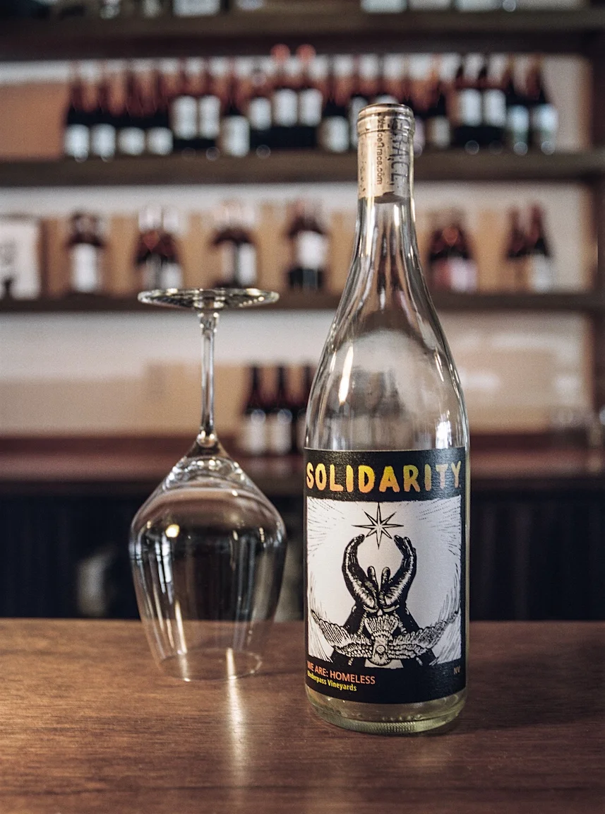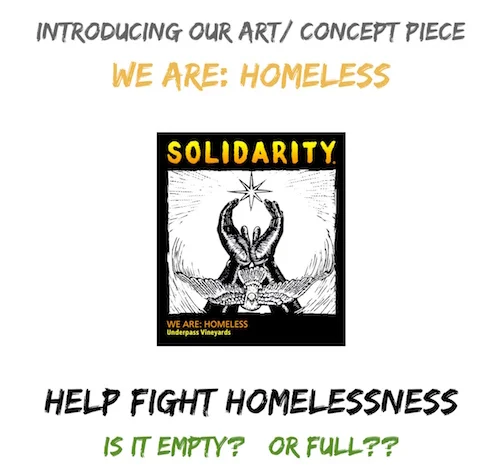 What is it? This wine bottle (with a cork seal and Solidarity label, “We Are: Homeless”) which may appear “empty” at first glance, is not filled with wine, but is overflowing with heart and gratitude. It is intended to be interactive but Not instructive, with each participant bringing their own experience to it, and the “Ingredient” label on the back of the bottle providing thought provoking reasons for Homelessness in America.